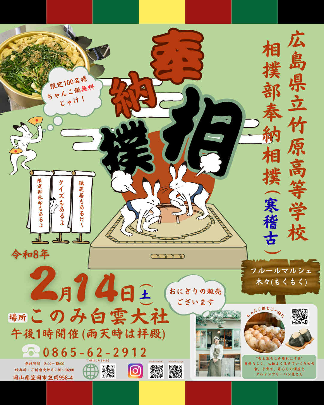 2月14日(土)当社の境内にて広島県竹原高等学校の相撲部の皆様による奉納相撲が行なわれます!
